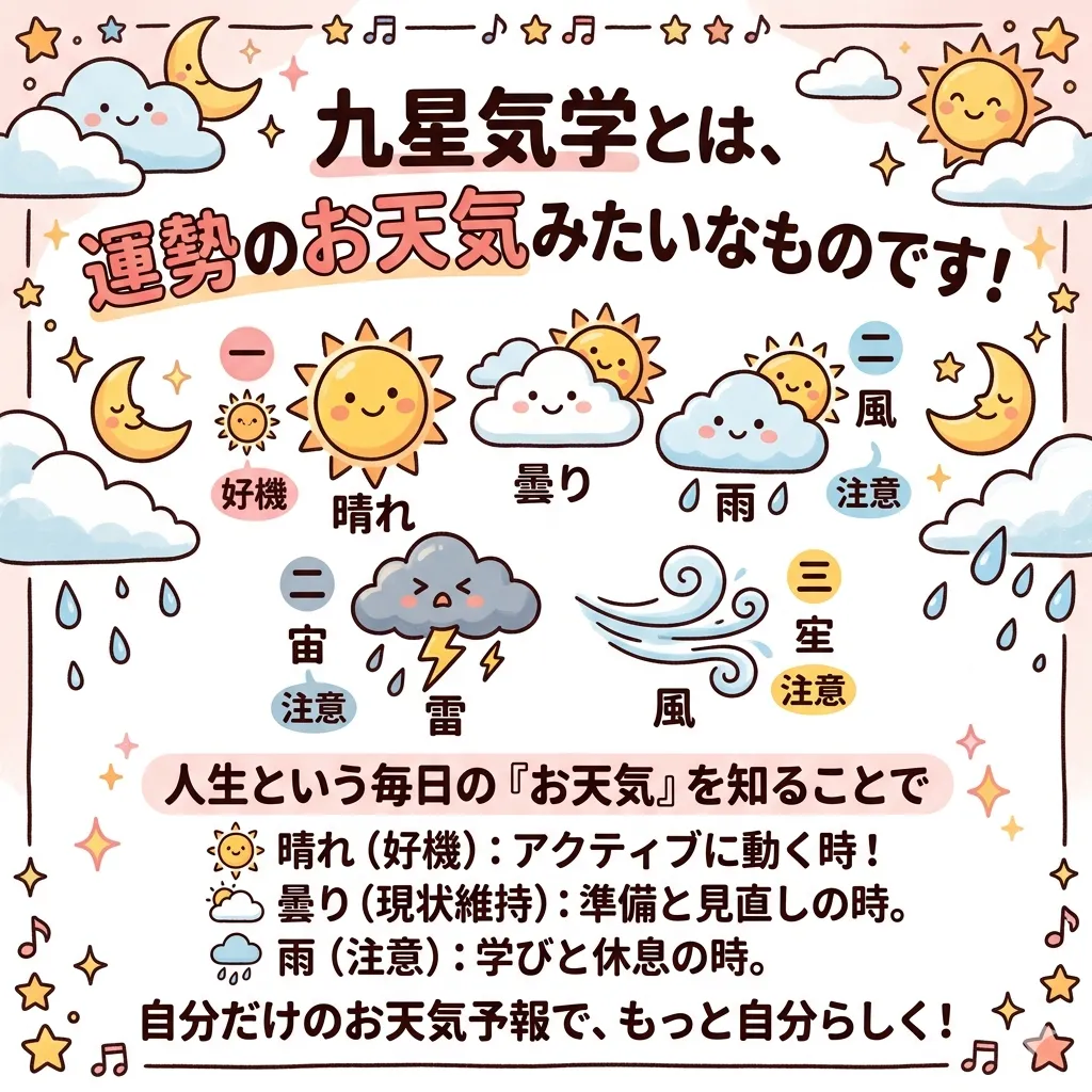 九星気学って聞くと難しく感じるかもしれませんが、実はとっても身近な**「人生のお天気予報」**のようなものなんです!☀️☁️☔️