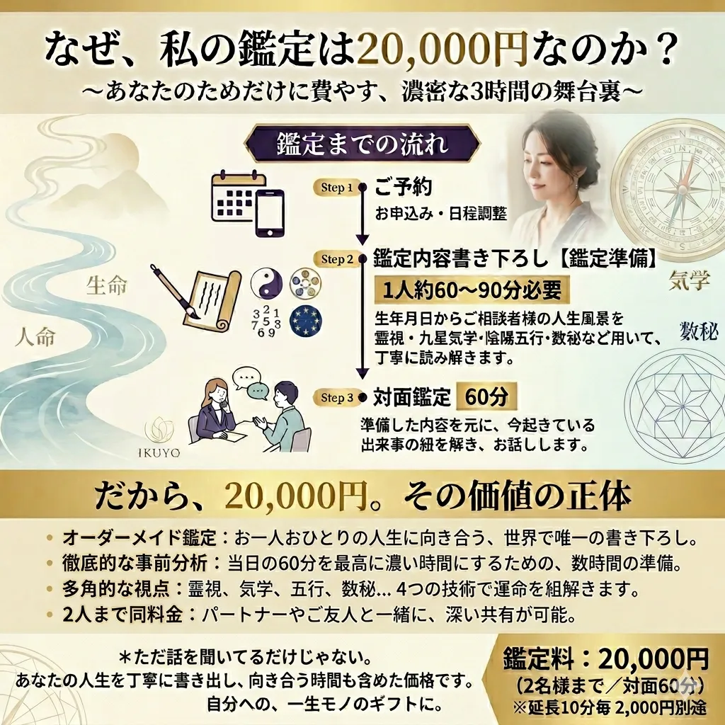 鑑定料は、私からあなたへの敬意であり、あなたから自分自身への「お疲れ様」の贈り物。妥協せずに、最高に濃密な時間を自分にプレゼントしてあげませんか?
